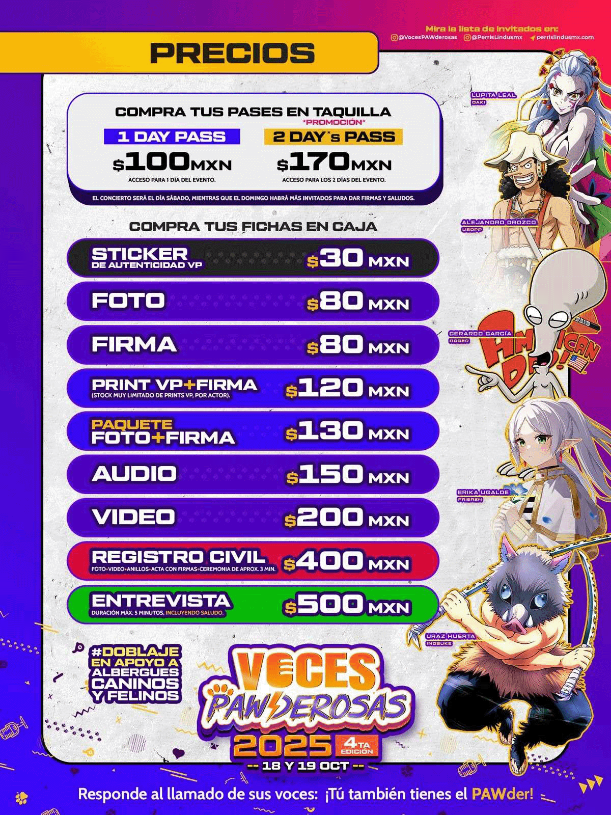 Los boletos podrán ser adquiridos en la taquilla del recinto con un costo de $100 MX por día o bien, $170 MX para ambos días. Además del acceso, la firma de autógrafos y demás mercancía tendrán costos adicionales, a continuación están los precios de todos los productos y servicios que se podrán adquirir en el evento. Cabe recalcar que las ganancias de este evento serán destinadas para la compra de alimento para los perritos y gatitos de diferentes albergues en México.